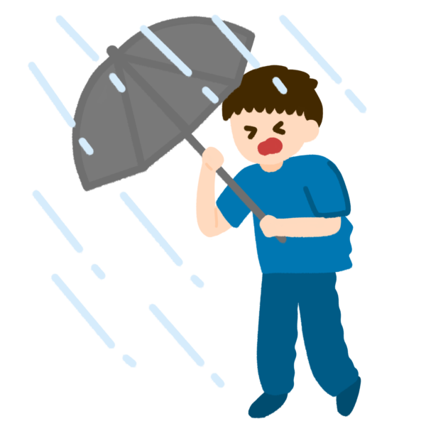 大雨のなか、傘をさす男性のイラストです。
