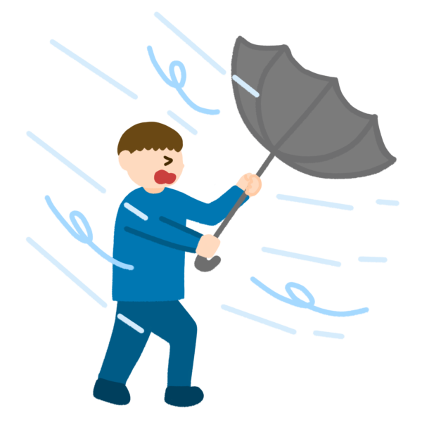 強風でひっくり返った傘を必死で掴む男性のイラストです。