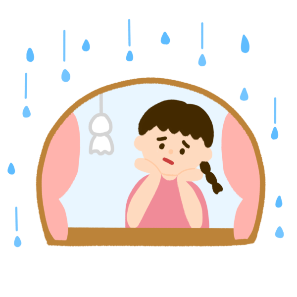 窓から外を眺めて、天気が雨でガッカリしている女の子のイラストです。