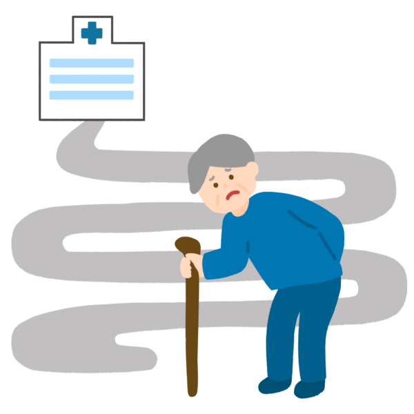 病院が遠く困っているおじいさんのイラストです。