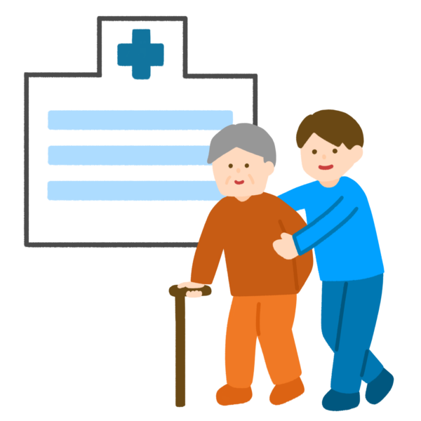 病院に通院するおじいさんと付き添いの男性のイラストです。
