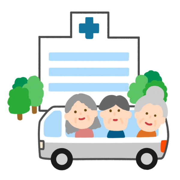 病院にバスで通院する高齢者のイラストです。