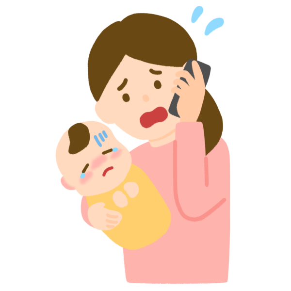 体調不良の赤ちゃんを心配して電話するお母さんのイラストです。